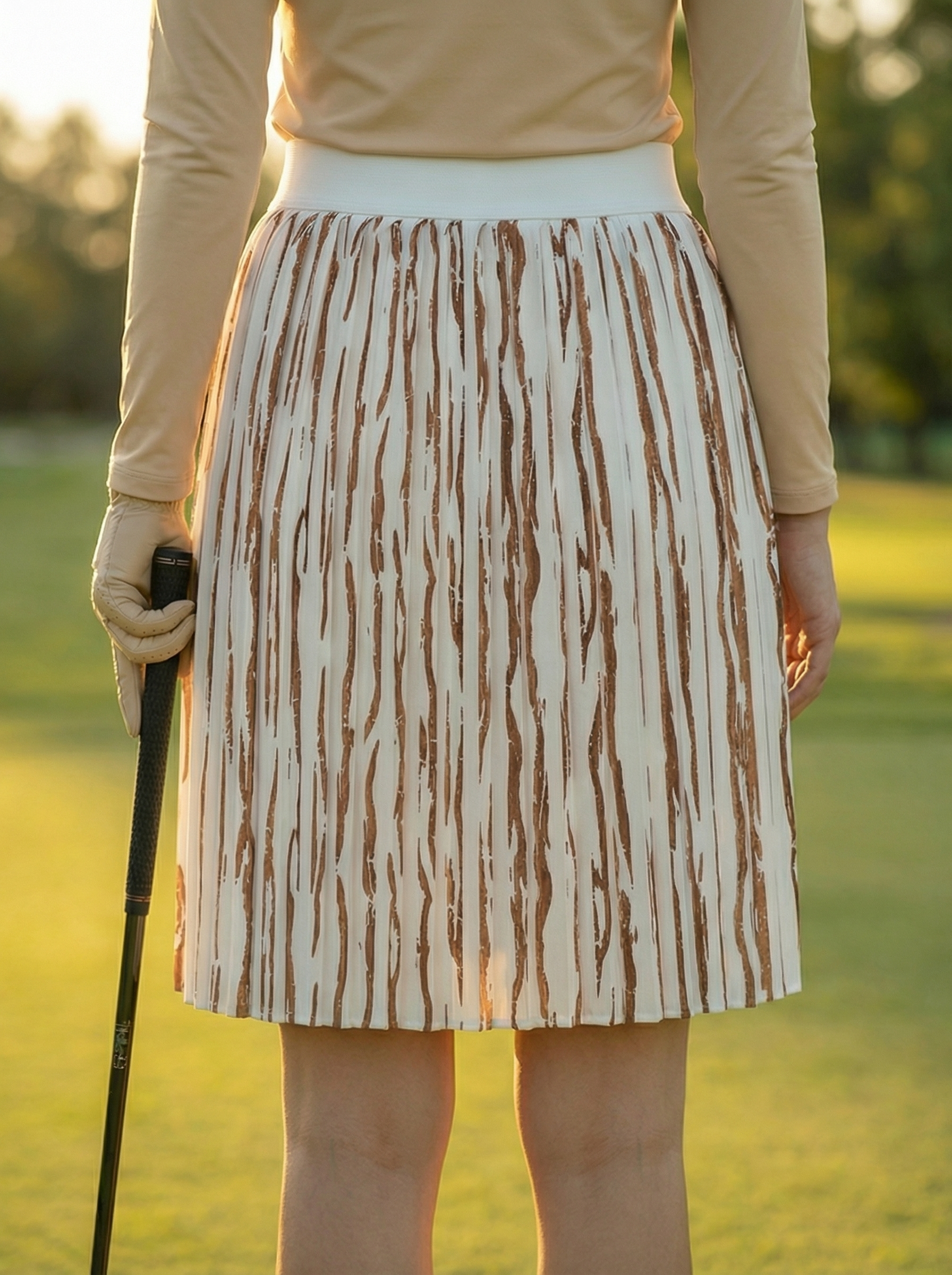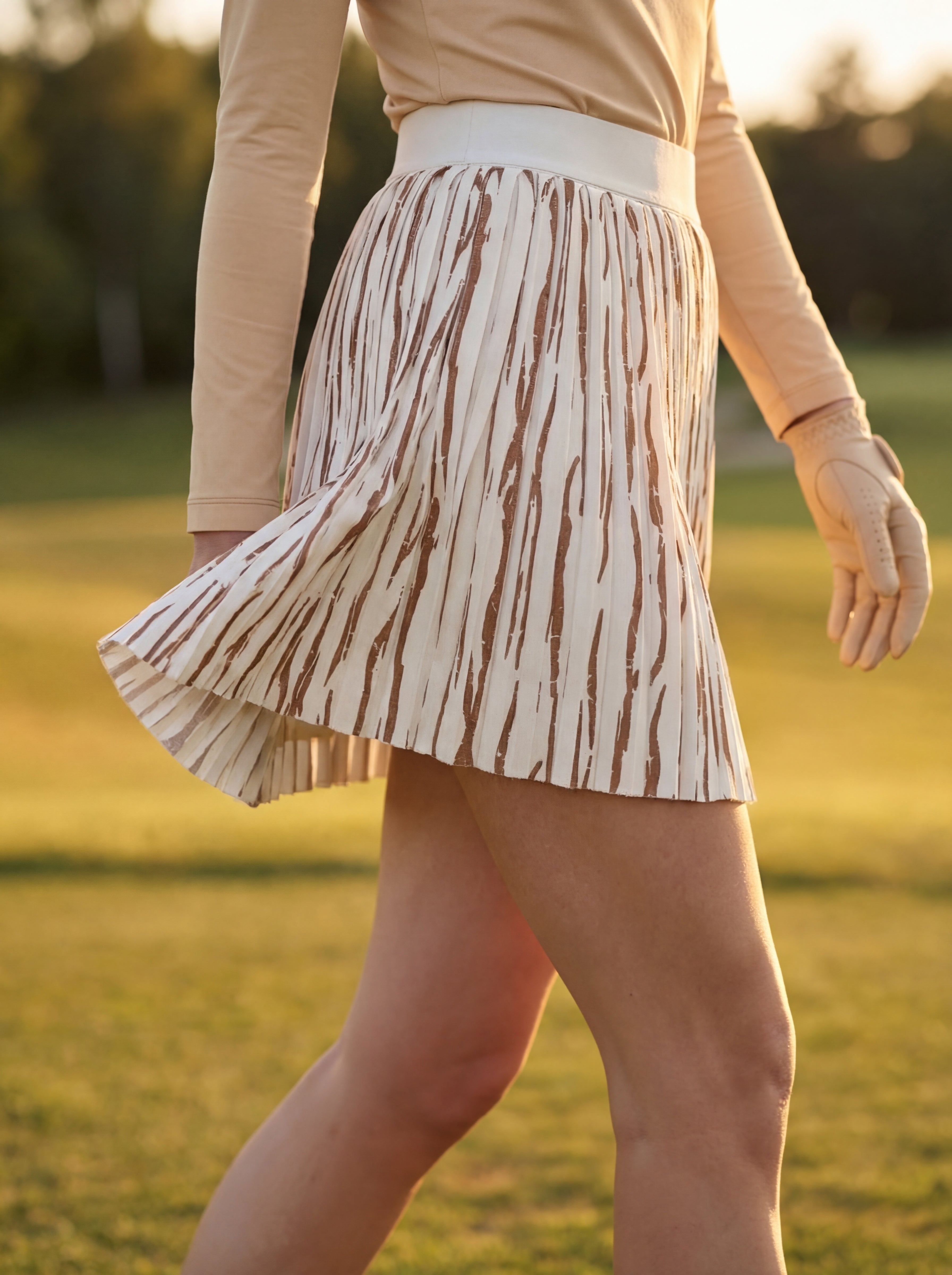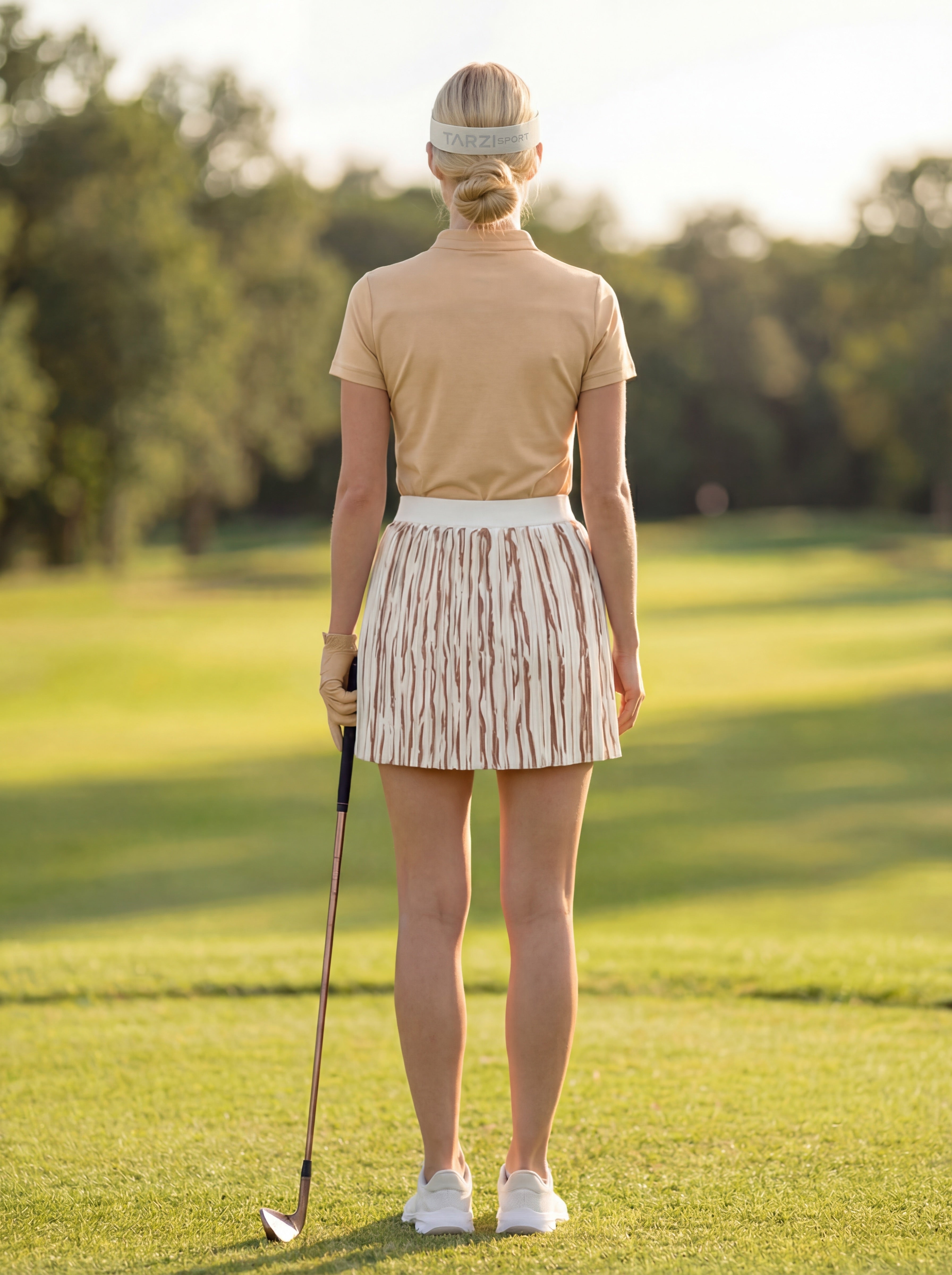 Runway Gleam Golf Skort by Tarzi Sport® is a women’s golf skort designed with sculpted pleats and an exclusive foil print finish. This golf skort for women features structured designer pleats that create a clean, elevated silhouette. Designed as a golf skort with built in shorts and pockets, it ensures functionality and ease. Available in short and above the knee lengths, it pairs seamlessly with Tarzi Pearl and Tarzi Champagne golf tops, offering versatile fashion looks on and beyond the course.