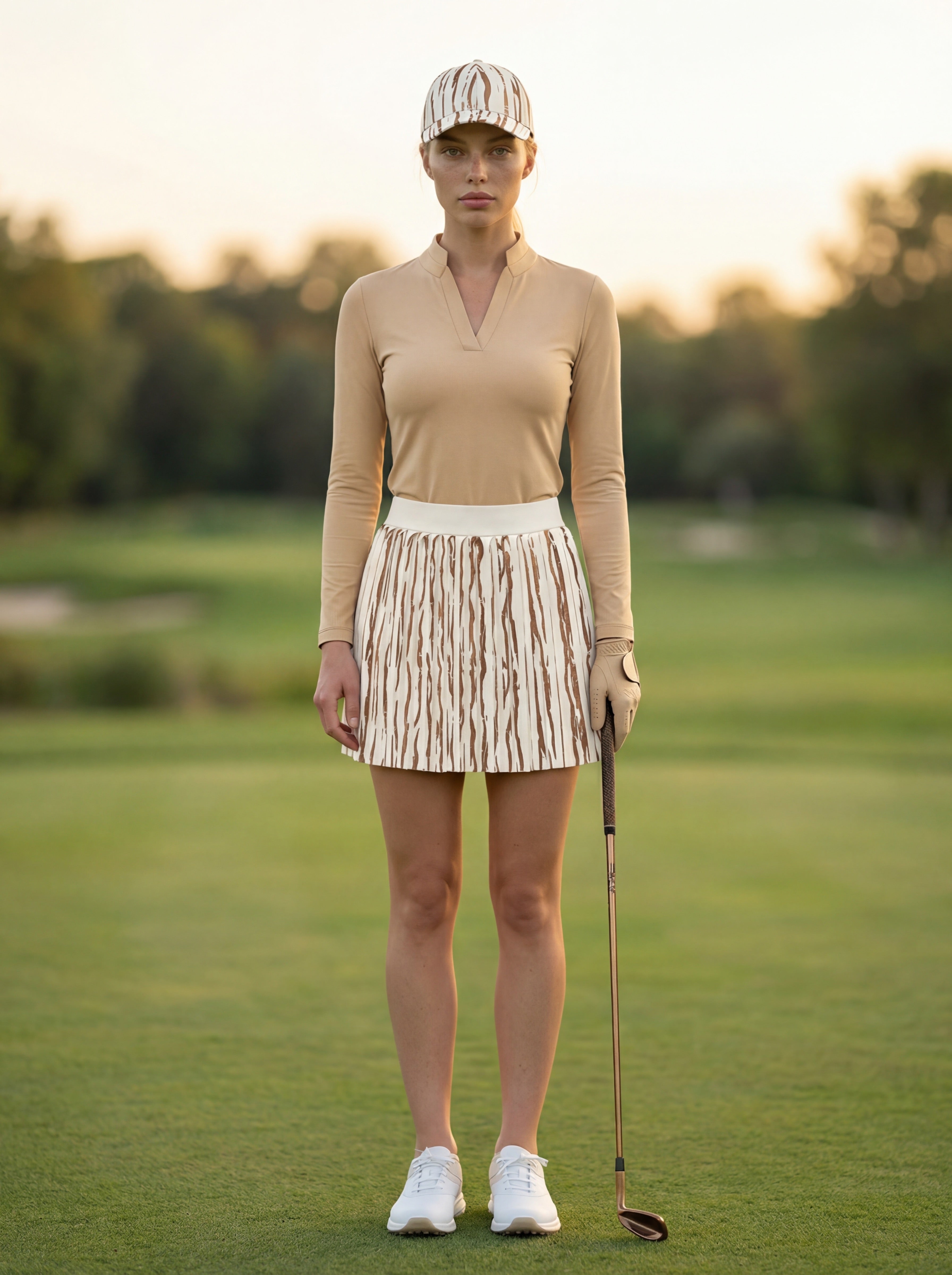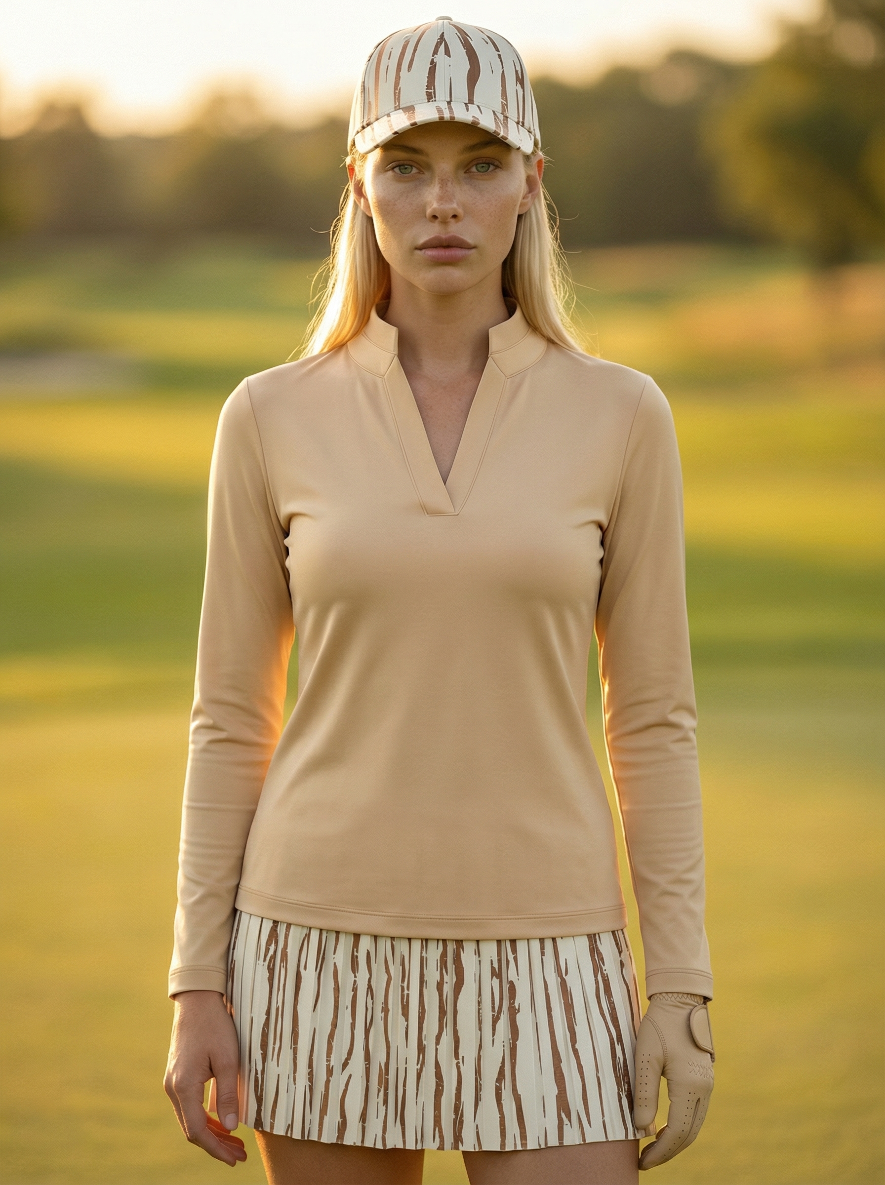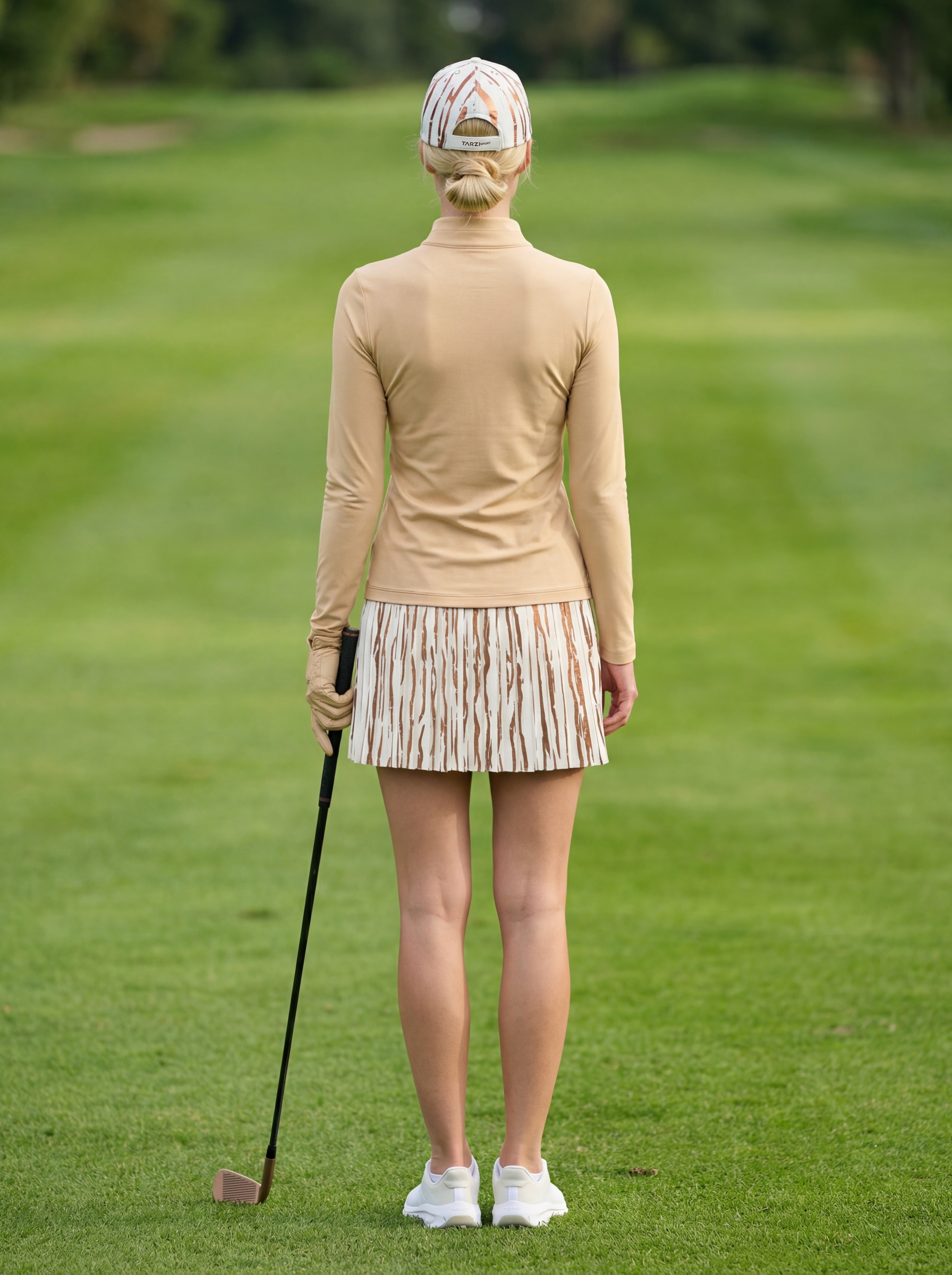 Runway Gleam Golf Skort by Tarzi Sport® is a women’s golf skort designed with sculpted pleats and an exclusive foil print finish. This golf skort for women features structured designer pleats that create a clean, elevated silhouette. Designed as a golf skort with built in shorts and pockets, it ensures functionality and ease. Available in short and above the knee lengths, it pairs seamlessly with Tarzi Pearl and Tarzi Champagne golf tops, offering versatile fashion looks on and beyond the course.