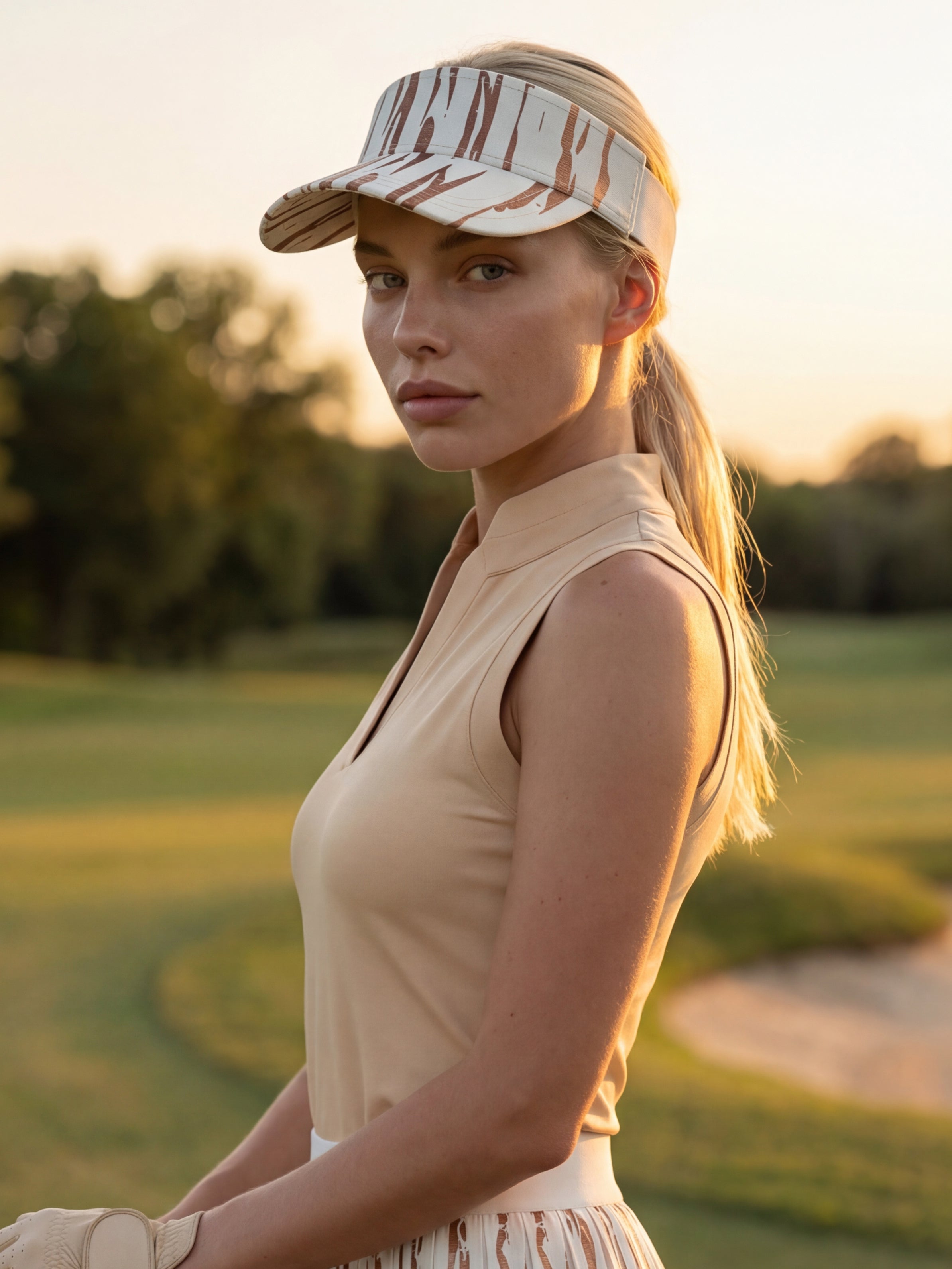 Runway Golf Headwear by Tarzi Sport® is a women’s golf headwear series designed to bring a touch of fashion to the game. Featuring a signature Tarzi print and an exclusive foil finish, it adds a subtle luminous shine and elevated detail. Available as a golf visor and a golf cap, it creates a balanced and intentional look while framing it with a polished, refined finish.